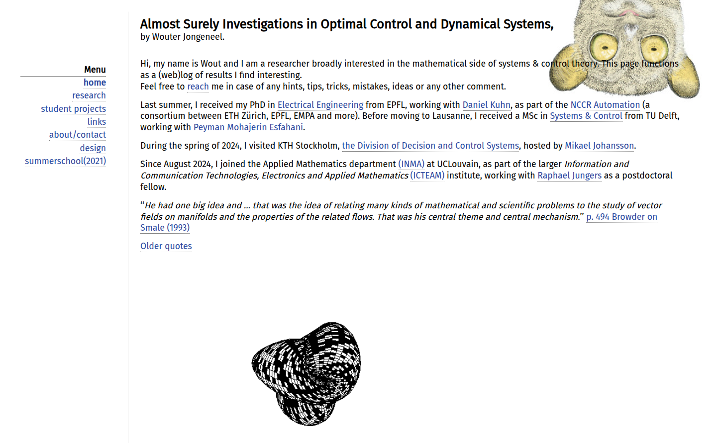 Hi, my name is Wout (01) and I am a postdoctoral researcher at KTH Stockholm and Digital Futures (02). I am broadly interested in the mathematical side of systems & control theory (03), in particular, I am fascinated by the synergy with topology and questions that arise in the context of synthetic biology. Feel free to reach out.